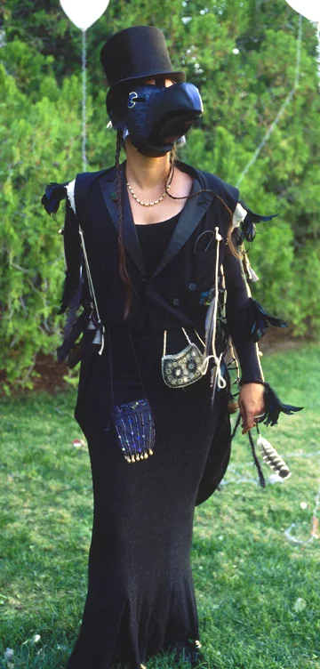 She was no fiction or figment of the imagination, but solidly present and gloriously real. Tall and stately, dressed in black. Beneath the top hat round, intelligent eyes peered over an enormous, sharp, blue-black beak. From the shoulders and sleeves of her closely fitted jacket dangled long, solitary feathers; two small, beaded and jeweled purses hung around her waist and jingling bells, benevolent warnings, were sewn onto her long skirt. Thus she worked, intensely focused all day, delivering messages from one spirit to another; she spun, her feathered wings and belled skirts flying; she rested, leaning her sleek black figure into the thick cushion of bushes as if into a crow’s nest. As soon as I caught a glimpse of her I knew I had to send a message.