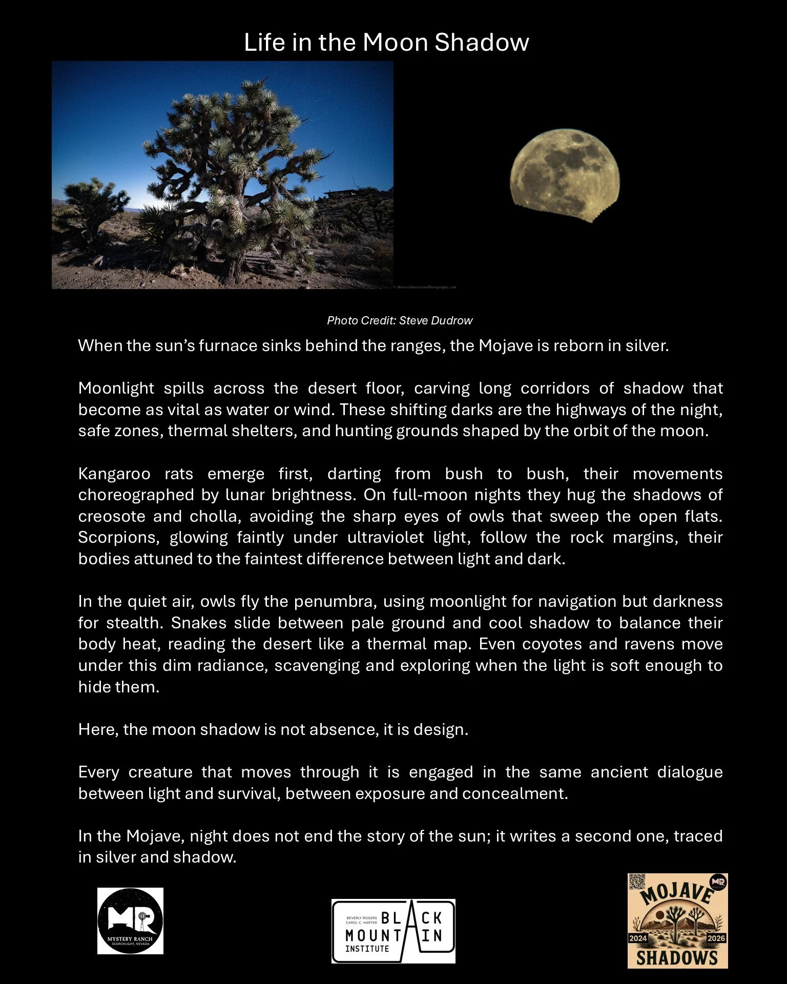 Steve Dudrow is a photographer, Certified Interpretive Guide, Public Lands Volunteer, Children’s Book Author and Podcast co-host who recently stayed at the Mystery Ranch as part of his Mojave Desert art project called Shadows in the Mojave. Through this project, Dudrow delves into the vital role shadows play for the diverse inhabitants of this harsh environment, including reptiles, insects, animals, birds, and flora—humans, too. He is also investigating the intriguing contrasts between the shadows cast by daylight and those illuminated by the moon.